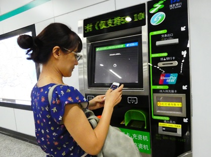 スマホ決済社会が浸透している。タクシーの運転手とはスマホのアプリを合わせることで料金が決済され領収書がプリントアウトされる。地下鉄はスマホで5日間通用する専用カードを購入、そのカードでどこへでも行くことができ、帰国日にマシンに返却すると使用分だけ口座から引き落とされる(写真)。スマホ決済が庶民に至るまで普及している。「日本は遅れ