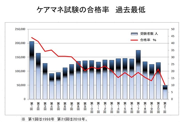 が5年以上かつ900日以上、?特定の施設等で法により必須とされる相談援助業務の従事期間が5年以上かつ900日以上、へと変更。経過措置を経て2018年から実施された。その結果、受験者数は49,333人、合格率は10.1%、ともに過去最低となった(図参照)。この落ち込みが、「ケアマネVer.2」の誕生の年となることを期待したい。
