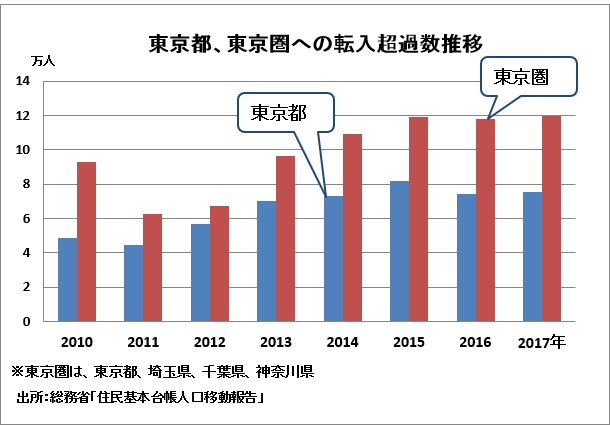 東京への過度な人口集中が続いている。1月に公表された総務省の「住民基本台帳人口移動報告」によると2017年の東京都への転入超過数(転入者-転出者)は7万5498人