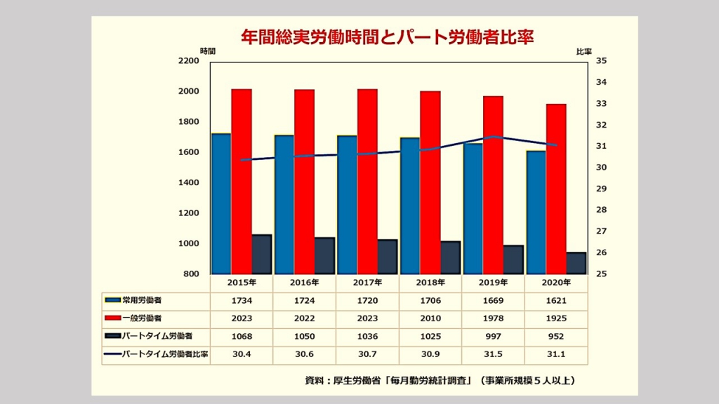 最近の労働時間の状況を確認しておこう。2020年の「年間総実労働時間」は「常用労働者」では1621時間、「一般労働者」では1925時間、「パートタイム労働者」では952時間である。減少の傾向がみられるものの、「一般労働者」の「働きすぎ」は変わらないし、「不合理な待遇差」を含む「パートタイム労働者」の割合はいまや3割を超えている(図表)。