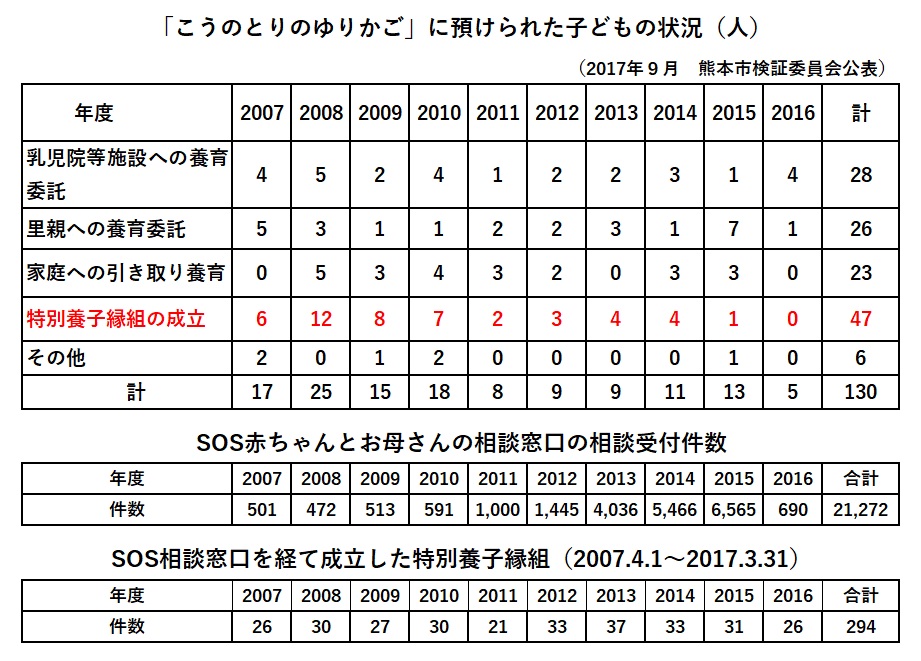 「こうのとりのゆりかご」設置と同じ頃に「SOS赤ちゃんとお母さんの相談窓口」を設け、こちらは10年で294件の特別養子縁組が成立した(表参照)。