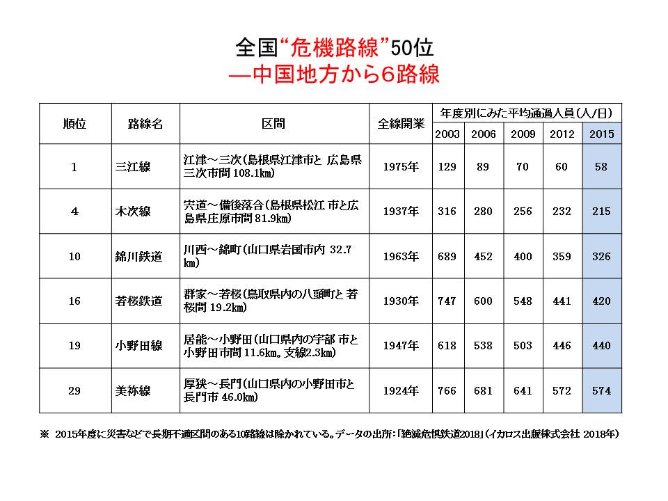 4月からの年度始まりを前に交通機関の春のダイヤ改正が報じられる。そのなかに路線の統廃合や経営形態の見直しなどもある。採算性の目安は平均通過人員(1kmあたりの乗車人数)4,000人/日、廃線を判断する目安は平均通過人員2,000人/日とも言われている。私の住む中国地方には岐路に立たされている路線が少なくない。全国“危機路線”ランキング50位以内に6路線が入っている(表参照)。