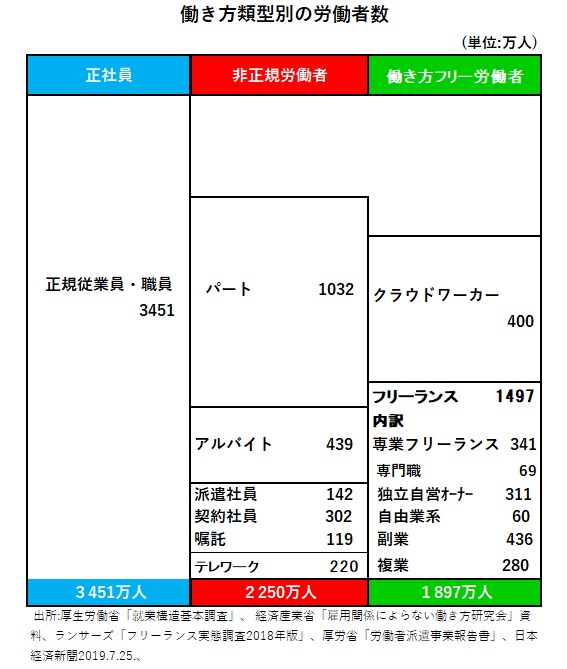 現在、正社員で働いている人は3400万人、非正規労働者が2100万人いるのに対して、「働き方フリー」も1800万人と、正社員や非正規にも迫る勢いで、労働市場に確固たる位置を占める存在になっている。