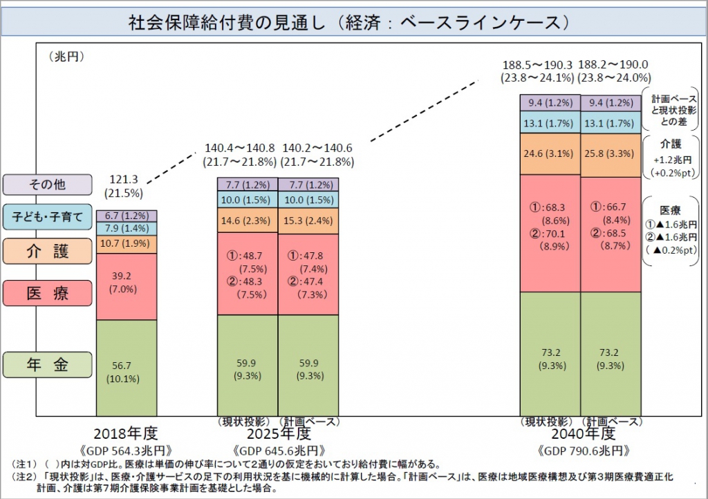 2040年をターゲットにしたのは団塊ジュニア世代が65歳に到達する年だからだ。これまで団塊の世代が75歳以上となる2025年に照準を置いていたが、さらにその先を見据えようという考えから来ている。社会保障費は2025年を超えても増加の一途というのである。