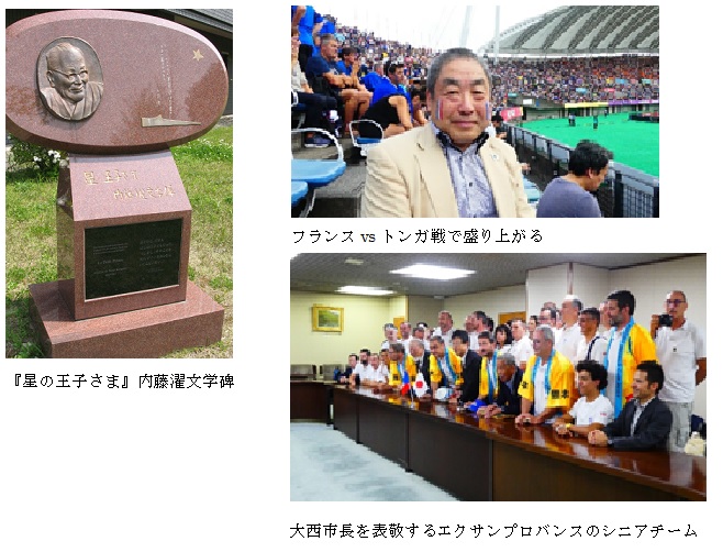 民総合運動公園陸上競技場で「フランス対トンガ」戦が行われた。交流都市のエクサンプロヴァンスからは、シニアラグビーチーム一行が10月3日に来熊。大西一史熊本市長を表敬、歓迎レセプションが行われた。5日には熊本のシニアチームとの親善試合を行い、本番のトンガ戦に乗り込んだ。入場者数は大会発表によると福岡の博多の森球技場を1000人以上超える28,477名でほぼ満員。三色旗を顔に塗りフランス国歌を歌いながら立ったり座ったりウェーブの応援に参加した。最終的な経済効果の実績発表はまだだが、約100年前に内藤濯氏が蒔いた文化の種が花開き実をつけた歴史の重さを感じた。私は早稲田大学で内藤濯先生の愛弟子の田辺貞之助先生に師事したこともあり、熊本日仏協会に入会し、恩返しのつもりでフランス語の通訳ボランティアを引き受けた。