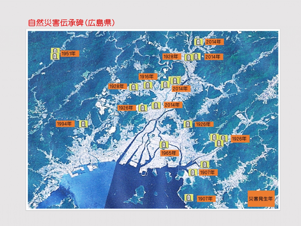 国土地理院のホームページでは「自然災害伝承碑の取組」欄がある。地理院地図では46都道府県150市区町村の「自然災害伝承碑」472基が公開されている(20年3月1日現在)。広島県からは19基が入っているが、そのなかに今回の西日本豪雨災害で多くの犠牲者を出した地区の100年以上前に起きた水害を伝える石碑もある(安芸郡坂町周辺。写真の右下)。同ホームページでは、「石碑があるのは知っていたが関心を持って