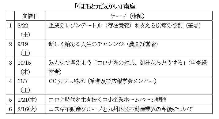 法人「くまもと新創生プロジェクト」(筆者が監事)と、地元コンサルの(株)南星が推進している「元気ゆい倶楽部」との合同による「くまもと元気かい」講座を企画、2020年度からいくつかのテーマで実施した(表参照)。