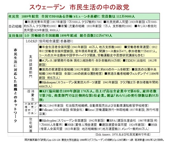 築に大きな役割を果たした組織は社民党と、それとタッグを組んだLO(労働組合)である。20世紀後半の社民党は「巨大な自己組織を持つだけでなく、市民生活密着型組織を広範に系列化している」「社民党組織のネットワークは、市民生活のあらゆる領域にまで浸透しており、文字通り、政党が市民の生活風景の一部になって」いた(表参照。岡沢憲芙「政党」東京大学出版会 1988年)。21世紀に入って、社民党は、LO(組合員数はこの40年間に80万人強減少)とともに、以前のような勢いはみられないものの、「中間組織」としての役割は失せていないように思われる。