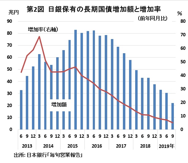 入れをその保有残高の増加額年間約80 兆円をめどとしつつ行う」というものだが、実際には9月末時点で保有残高は年間22兆円増にとどまっている。それも約80兆円台を維持した2016年をピークに減少の一途なのだ(図表参照)。